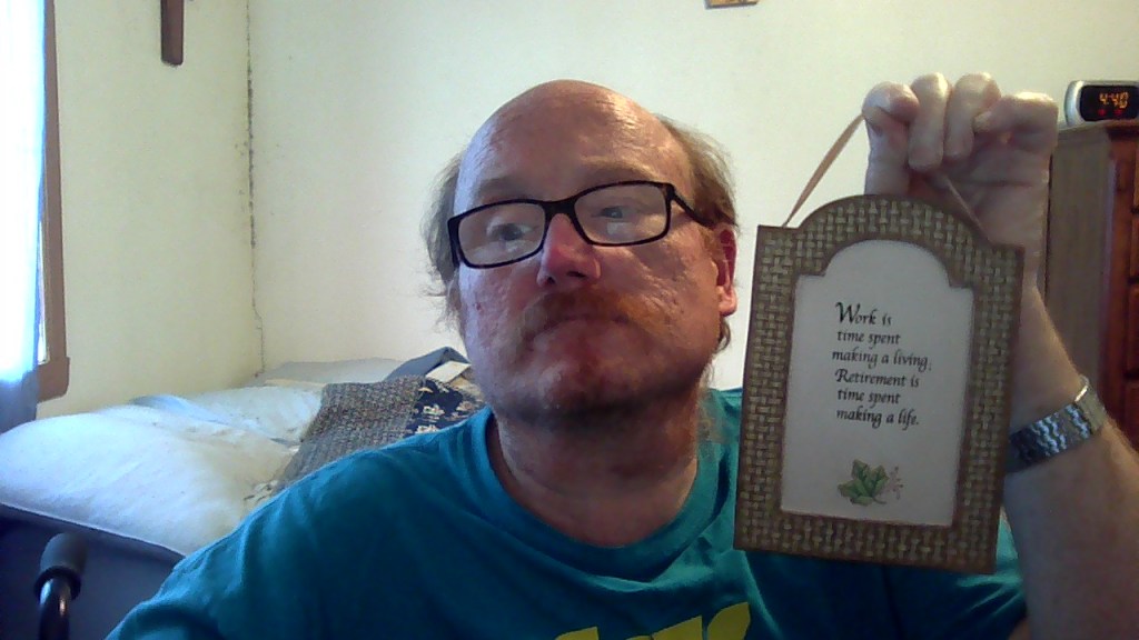 Here’s what the plaque says in the picture: “Work is time spent making a living; retirement is time spent making a life.”
